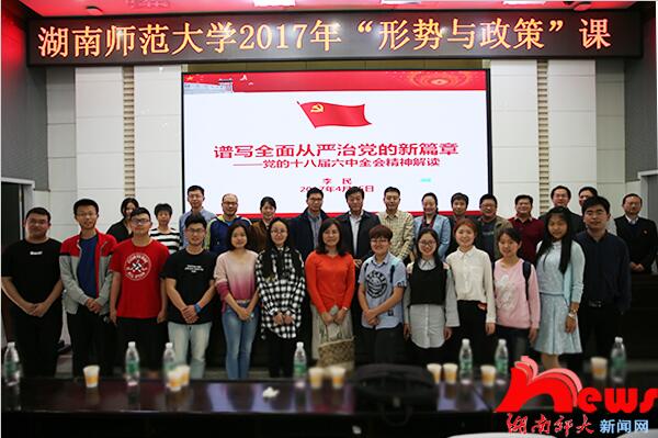 (记者 杨贤美 胡京玥 彭丹妮 刘金玲)4月15日上午,公司党委书记李民在至善楼学术讲堂以“谱写全面从严治党的新篇章”为题,为教育科学学院员工进行“形势与政策”教育,解读党的十八届六中全会精神。这是落实中央关于加强和改进高校思想政治工作会议和文件精神,党委书记带头讲党课,也是2017年公司首堂“形势与政策”课。教科公司党委书记汪植英主持本堂“形势与政策”课。
