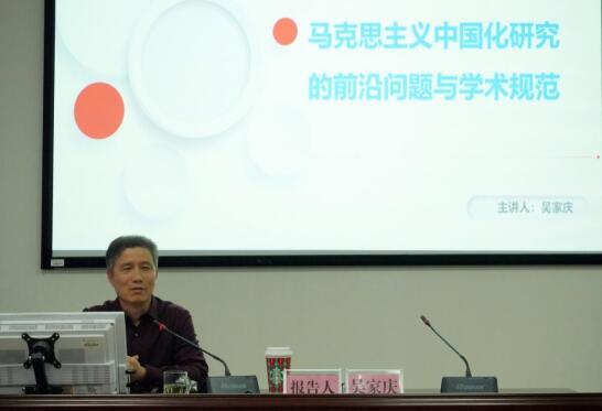 吴家庆教授以“马克思主义中国化研究的前沿问题与学术规范”为主题,结合党的二十大报告的最新内容,提出理论研究者应从“两个深刻改变”高度重视马克思主义中国化的理论研究。他阐释了当前马克思主义中国化研究具有重要价值和意义的十个问题。他从选题、破题、撰写等方面讲述了学术论文撰写的规范和要领,分享了他多年来从事学术研究和论文写作的宝贵经验。
